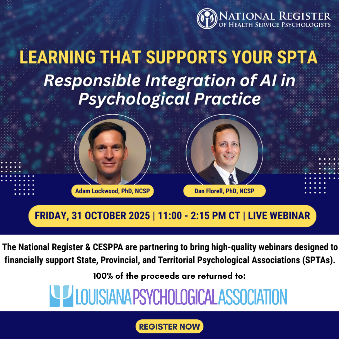 This webinar will take place from 11:00am CST to 2:15pm CST and will include a 15-minute break. As long as you register by 10/31, you can join the live session or access the archive on the National Register’s continuing education website. All attendees will earn three (3) CE credits or contact hours (NY Board of Psychology).